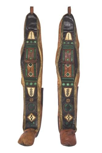 The Hausa seem to have the most documented shoe history of the continent. Their leatherwork is considered legendary throughout West Africa and their intrinsic work has constructed the likes of boots and sandals. They were known to dye their leather with natural pigments like henna to create the striking appearance. Camel-riding boots from the early 20th century has seen the Hausa incorporate woven leather as decoration. The boots, used to protect their legs from sand, chafing and sun, had toe dividers allowed the wearer to grip a knotted strap. To complement their royal cloaks and gowns, the Hausa emirs in Northern Nigeria would line the insets of their footwear with ostrich feathers.