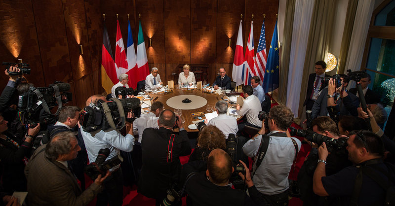 Members of the G7 summit in 2015, in a room lined with barkcloth. FEDERAL GOVERNMENT OF GERMANY / KUGLER