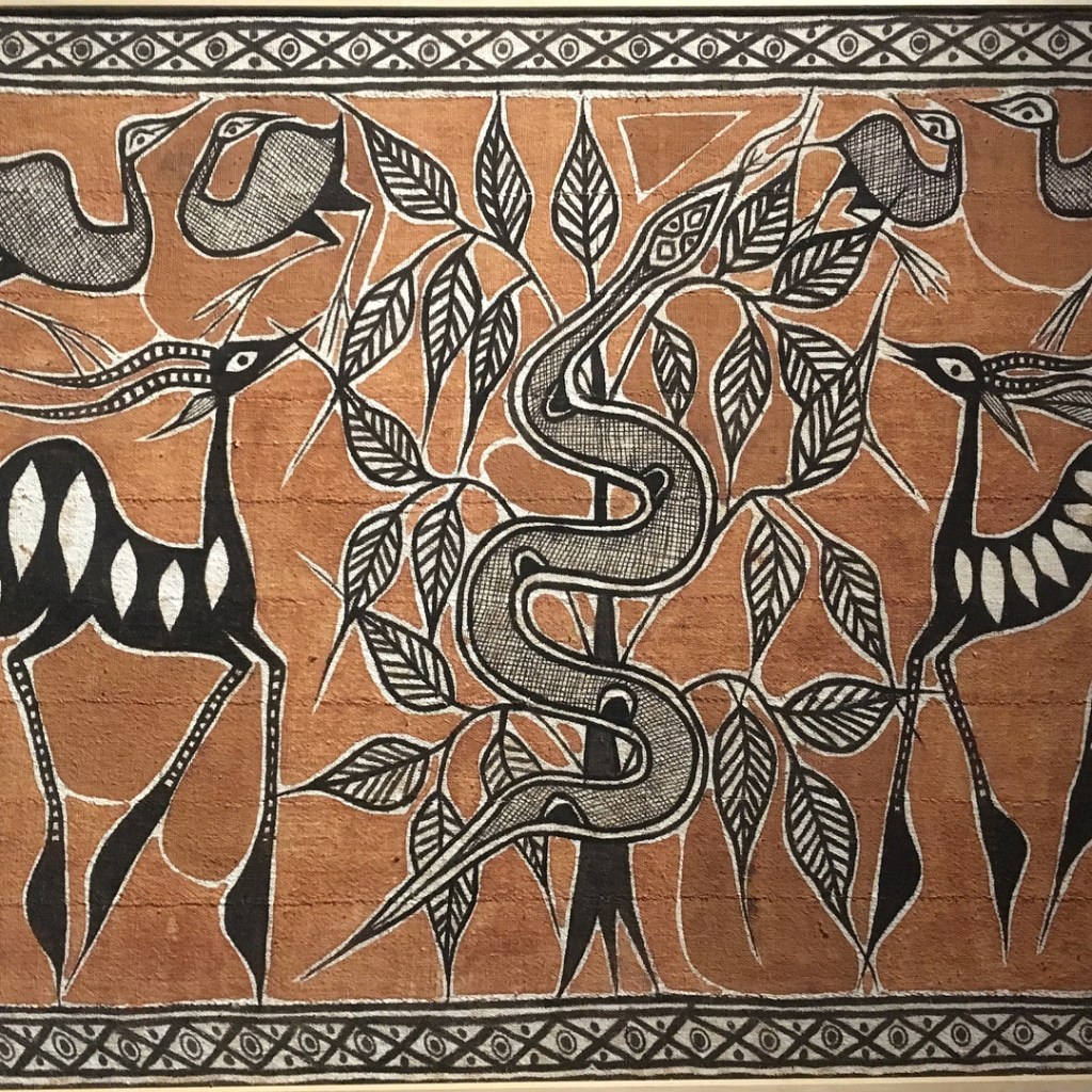 Like the Bògòlanfini of Mali, the Korhogo tends to be in earthy tones such as creams, browns and blacks. Using fermented mud and natural vegetable pigment, the artists use simple tools to draw animal, celestial and human forms on the cotton strips of fabric, sews together to make a large hanging. According to ‘African Fabrics – Sewing Contemporary Fashion with Ethnic Flair’, the designs are influenced by paintings that were used to decorate shrines in the past. Due to the elements, these painting would wear off with time. Thus, the Senufo decided to transfer them to cloth to prolong their lifespan. This established an indigenous industry to produce the fabric.