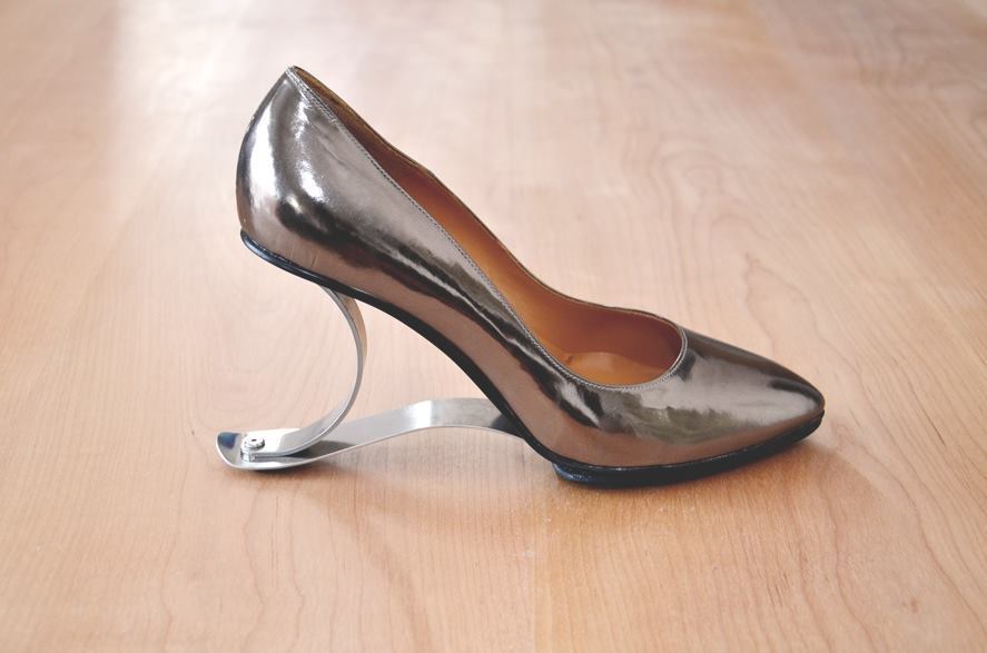 His solution was to replace the rigid bars in the heel with curved leaf springs and rubber sheets. These elements have high shock absorption capabilities that reduce the impact cause by stepping on the heel. Thus while at rest the heel may be 10m high but in motion the heel only contracts and expands to approximately 3cm. This reduces the strain usually placed on the ankle, foot and toes whilst walking in heels and helps the wearer assume a more natural posture.